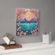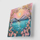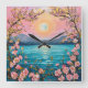 Lugn landskap förhöjd av levande färger och intrikata detaljer. I mitten lyser en fullmåne mjukt mot en pastellljus himmel som gradvis övergår från rosa till persikofärgad. På vardera sidan om månen finns avlägsna berg som ger scenen djup.