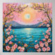 Lugn landskap förhöjd av levande färger och intrikata detaljer. I mitten lyser en fullmåne mjukt mot en pastellfärgad himmel som gradvis övergår från rosa till persikofärgad. På vardera sidan om månen syns avlägsna berg som ger scenen djup.