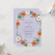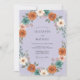 Denna design har en mjuk lavendelbakgrund prydd med en arrangemang av höstinspirerade blommor. Rika brända orange dahlior och krämiga vita zinnior är boende bland dämpad tealgrön bladverk och ömtåliga kvistar. Paletten blandar svala pastelltoner med varma skördefärger för en unik och romantisk estetik.