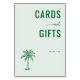 Denna bröllopsdekoration har en minimalistisk design med en lugnande ljusgrön bakgrund och mörkgröna accenter. Layouten inkluderar fet, versal text som lyder "CARDS and GIFTS" med ett elegant kursivt "and", kompletterat med ett mindre "Tack" nedan. En enkel palmtradsillustration lägger till en tropisk touch till den moderna, återhållsamma estetiken. De rena linjerna och det negativa utrymmet skapar en lugn atmosfär, perfekt för att uttrycka tacksamhet på din speciella dag.