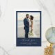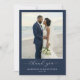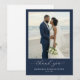 Det här bröllop tack-kortet har ett fantastiskt beach-foto som ramas in av en djupblå kant och skapar en elegant och lugn komposition. Färgpaletten omfattar mjuka naturliga toner av beige sand, ljusblå himmel och vita blomsterdetaljer som står vackert i kontrast till den marinblå ramen. Designen använder en digital tryckteknik för att fånga realistiska detaljer och förstärker den livaktiga representationen av det intima ögonblicket på stranden. Under fotot är "tack" elegant skrivet i kursiv stil med betoning på tacksamhet, medan anpassningsbara platshållare för namn och datum möjliggör personalisering. Den övergripande känslan är uppriktig och festlig, perfekt för att uttrycka uppskattning efter en minnesvärd bröllopsdag.