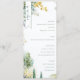 Denna eleganta bröllopsmeny har en vertikal layout med en harmonisk blandning av blom- och botaniska element, vilket skapar en lugn och sofistikerad atmosfär. Designen visar upp mjuka pastellfärger som blekgul, dämpade gröna och subtila blå nyanser, förstärkta av akvarellillustrationer som ger en delikat touch. Typografin är raffinerad, med kursiv stil för ordet "meny" och rena sans-serif-teckensnitt för tydlig läsbarhet, medan rikligt med utrymme säkerställer ett strukturerat utseende. Perfekt för par som söker en organisk och lugn estetik, fångar denna meny naturens och friskhetens väsen, vilket gör den idealisk för alla romantiska firanden.