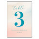 Denna eleganta bordskort för bröllop har en minimalistisk design med en mjuk, akvarell-liknande bakgrund i pastellfärger i persika, rosa och ljusblått. Fokuspunkten är en djärv teal-siffra "3", kompletterad med ordet "bord" i delikat kursiv stil ovanför. Under siffran finns anpassningsbara textfält som möjliggör personalisering med namn och datum i en ren sans-serif-teckensnitt. Den övergripande stilen är modern och lugn, perfekt för att tillföra en touch av sofistikering till er bröllopsmottagning.