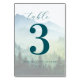 Det här bröllopsbordskortet har en lugn naturinspirerad design med dimmiga berg och städsegröna träd i mjuka pastellgröna och blå nyanser som skapar en fridfull atmosfär. Layouten är balanserad och centrerad och visar en djärv teal-siffran "3" och elegant kursiv typografi för ordet "bord". Anpassningsbara element möjliggör personalisering med namn och datum, vilket gör det perfekt för bröllop eller formella sammankomster. Det abstrakta men igenkännbara landskapet framkallar känslor av lugn och romantik, perfekt för att skapa en inbjudande och harmonisk stämning på din speciella dag.