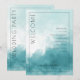Det här bröllopsprogrammet har en modern och elegant design med en akvarellbakgrund i nyanser av teal och turkos, vilket skapar en lugn och romantisk atmosfär. Layouten är uppdelad i två sektioner av ett centralt vitt utrymme, med ordet "VÄLKOMMEN" vertikalt på vänster sida i fet, sans-serif-typografi. Till höger presenteras en strukturerad lista som beskriver ceremonins tidsschema med en mindre serif-stil, medan namnen och datumet är anpassningsbara platshållare längst ner. Den övergripande stilen blandar minimalism med sofistikation, vilket gör den perfekt för en formell bröllopsfest.