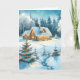 Personlig julkort. Vacker festlig timmerstuga upplyst med julbelysning mot en bakgrund av vackra snötäckta träd.
