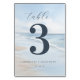 Det här bröllopsbordskortet har en lugn strandscen med mjuka vågor och en mjuk blå himmel som skapar en avspänd och inbjudande atmosfär. Designen visar en stor siffra "3" i fet marinblå färg, kompletterad med elegant kursiv typografi för ordet "table", medan anpassningsbara platshållare möjliggör personalisering med namn och datum. Den minimalistiska stilen betonar rena linjer och öppenhet, förstärkt av en akvarelleffekt som ger en drömlik kvalitet åt strandbakgrunden. Perfekt för att tillföra en touch av sofistikering till ditt speciella tillfälle, fångar detta kort essensen av avkoppling och firande.