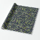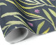 Mönster av gröna bladrika klätterväxter med små rosa blommor på en mörkblå bakgrund. Designen är frodig och organisk och förmedlar en känsla av lugn och natur.