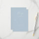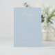 Detta eleganta bröllops-svarskort har en minimalistisk design med en mjuk pastellblå bakgrund och knivskarpa vita texten. Layouten är centrerad och skapar ett balanserat och harmoniskt uttryck, perfekt för formella tillfällen. Med rena sans-serif-teckensnitt och ett elegant kursivt skrivstil för betoning, utstrålar kortet sofistikering och klarhet. Dess lugna och inbjudande stämning gör det idealiskt för att samla in gästernas svar med grace och enkelhet.
