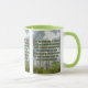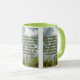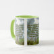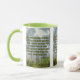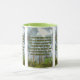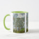 I den här tvåtonsbilden i mugg visas en symbol som innehåller ett Bobby Jones Soft-tryckteckensnitt med grönt brev mörk grönt kontur som visar KJV-bibelskriften "Luke 17:6" över bild med en markuppåtriktad vy som visar en samling krukor i skogen omgiven av ett ljust grönt gräs under en ljussken blå himmel i bakgrunden av detta trosbaserade tema. Den här versen refererar till Bok i Luke 17:e kapitlet som visar 6e-versen i detta bibelcitat från Kung James-bibeln. Behållaren och fälgen är glaserade i motsvarande färg i 11 eller 15 uns stora mikrovågsugn och säker keramikkonstruktion av diskmaskiner.