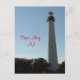 Cape May NJ är skrivet med rött skript. Söt röd vit fyr sent på eftermiddagen: Cape May, NJ., kapad bland träd. Vid ett besök där åkte vi för att besöka den mycket trevliga fyren, vackra Sunset Beach, Concreken Sunken Frakt och quaint shoppingstan, etc. Originalfotografi © TamiraZDesigns. Alla Höger reserverade.