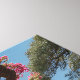 Ett urgammalt träd tungt av lysande magenta-rosa blommor välver sig över en frodig, solbelyst trädgårdsidyll. Symmetriska rabatter svämmar över av intensivt orange, gula, violetta, varmt rosa och vita blommor som inramar en slingrande stig av sten som leder till en lugn damm som speglar avlägsna palmer och robusta berg. Vita koloniala byggnader smälter in bland tropisk grönska under en perfekt blå himmel och skapar en atmosfär av ren glädje, överflöd, lugn och tidlös naturlig skönhet. Perfekt för vardagsrum, solrum, sovrum, hemmakontor, meditationsutrymmen, badrum eller som uppmuntrande presenter för trädgårdsmästare, naturälskare, välbefinnande-s