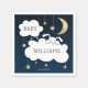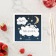 Söt party-napkin för din lullaby-nöjesdusch. Illustration av moln med en kniv som håller huvudet ur en av dem. Du kan lägga till babyens efternamn och händelsedatum. Det finns guld shimmery måne och stjärnor på en marin blå bakgrund. Namibjörnens ursprungliga illustration och design.