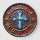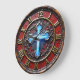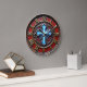 Make a bold statement of faith with this high-energy inspired wall clock. The central design features a striking, luminous blue cross set against a deep crimson backdrop, surrounded by intricate faux-metal scrollwork. While the outer frame beautifully mimics the appearance of weathered, dark-stained timber and the markers look like forged gold, this is a lightweight and durable graphic timepiece rather than actual wood or heavy metal. The dial utilizes bold Roman numerals in a metallic style to create a sophisticated, high-contrast look that is easy to read. The artwork features expert shading to provide a 3D-style depth, making the central cross appear to glow from within. This polished timepiece is an ideal focal point for a study, library, or living area, serving as a powerful and professional self-gift for those who appreciate ornate religious art.
