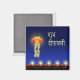Lycklig Diwali Illustration: En glansig Diwali-lampa med röd dija (kopp-formade indianska oljerampor) med gräns som prydnadsämne på nattetid himlar och hälsning skriven på sanskrit.