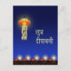Lycklig Diwali Illustration: En glansig Diwali-lampa med röd dija (kopp-formade indianska oljerampor) med gräns som prydnadsämne på nattetid himlar och hälsning skriven på sanskrit.