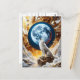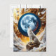 En majestätisk vit varg ylar mot månen, badad i ett gyllene ljus, mot en bakgrund av virvlande moln och himlakroppar. Vargen står på en klippavsats, dess silhuett inramad av halvmånen.