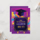 Inbjudan sprider sig med en upplopp av vibrerande färg, som sträcker sig från glad lila och nyp till soliga och strålande blues. Längst upp på sidan sitter en mörk blått pantskärmshatt, som tillför ett litet stilt schema mitt i det färgstarka kaoset. I texten på framsidan anges tonen för ett livligt firande, där gäster bjuds in att gå med i festligheterna med en aning av humor och kamaraderie. På baksidan, mot en djärv lila bakgrund, väntar inbjudan. Viktiga detaljer om evenemanget presenteras i lekfull och färglös text, vilket garanterar att gästerna är välinformerade samtidigt som man bibehåller inbjudningens roligt och vibrerande estetik. På det hela taget utlovar denna inbjudan ett firande fyllt av skratt, glädje och oförglömliga minnen, som perfekt fångar tillfälle anda i all sin färgstarka gloria.