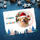 Sprid den festliga stämningen denna högsäsong med ett roligt och personligt julkort! Framsidan av detta kort har en ram med snöbollsmotiv, speciellt framtagen för att visa upp ett foto av din älskade hund, vilket ger en hjärtlig och personlig touch. De moderna, färgglada julgranarna längst ner i designen ger en livlig julstämning, medan gyllene stjärnor glittrar i bakgrunden för en magisk effekt. Ditt familjenamn är konstnärligt format runt fotot, vilket gör detta kort verkligt unikt. Orden "Merry" och "Bright" visas i en rad glada färger, vilket ger din julhälsning extra betydelse. På baksidan hittar du ett stilrent mönster med fyra moderna julgranar, som fullbordar kortet med en chic, festlig touch. Detta kort är det perfekta sättet att dela din kärlek