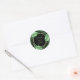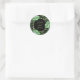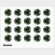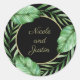 Ett vackert, tropiskt, botaniskt, runt klistermärke i svart och grönt, detta mönster har en ring av handflatan fronder och banans löv som omger den önskade texten. Det exempel som visas här visar namn på en brud och ett rum. Anpassa med namn eller annan text. Dessa klistermärken finns i två storlekar. Den lilla storleka är ett bra val för kuvertförseglingar eller för använda på små favörer och gåvor. Den större klisterlappen gör en fin partietikett, använda på större gåvor eller använda på andra artiklar.