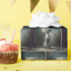 En lurvig långhårig katt med slående gröna ögon sitter med en frågande min mot en mystisk stadsbild i bakgrunden