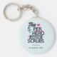 En nyckelkedja för personlig med ett sött och komisk ordspråk. Typografitexten säger: Den här superhjälten bär skrubber. Designad med en ljusblå stektskop och ett stort rosa hjärta och en rosa hjärtmonitorlinje. En ljusblå bakgrund med nedskjuten rosa polka dots.