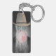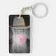 Lönsam akrylnyckelkedja med ett bubbelgummitema. Lustigt fotografi av en gammal kille som bar en cowboyhatt, överkorkade tonade skuggor och blåste en stor rosa bubbla med hjärtat. Art, bild och versell copyright © Shoaff Ballanger Studios, 2022.