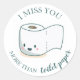 Lustigt klistermärke för dina kära vänner, med en ironisk papper illustration av toaletten och texten "Jag saknar dig mer än pappert på toaletten".