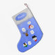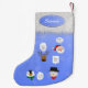 Jultomten, renar, penguin och snögubbe sjunger berömden sång: Vi önskar er ett God jul. Lustigt, sött och humoristiskt illustrerande för jul och nyår. Blå bakgrund med lakan-musik.