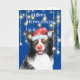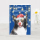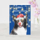 En lustig och söt vattenfärgsillustration av en svart och vit gräns-kollie med en röd tomhatt klädd med faux vit päls med rutnätsskuggor och en röd rennos. Han är uppsnärjd i Julafton träd ljus och ramas av långa lodräna i ljus och blå bakgrund. Perfekt för affärsårets slut önskemål till kunder eller som ett bra helgdag till vänner och familj.