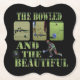 Bild är tre gräsmatta bilder i rektanglar, en svart gräsmatta, en bowlareare för avsvärtning av gräsmatta och en rolig, skäggig, vacker logotyp gjord av gräsmatta