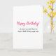 Ett lustigt kort för vänner och familj, på vit bakgrund står det i den rosa texten "Grattis på födelsedagen!" och under modern svart text "Du behöver åtminstone inte oroa dig för att dö ung nu".