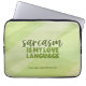 Tryck upp enheten med den här moderna grönten laptop sleeve. Den har en bakgrund för grönten av abstrakt och följande text: "Sarcasm är mitt kärlek-språk." Det finns även utrymme för anpassningsbar i grund, t.ex. namn, eller så kan den tas bort.
