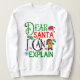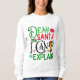 Den här roliga julskjortan visar på en lekfull design med vibrerande färg och festligt inslag. Frasen Kära Tomten, jag kan förklara, visas på ett tydligt sätt, tillsammans med visuella illustrationer av löv, en snöflinga och en glad pepparkaksgubbe som bär en julhatt.
