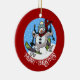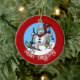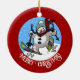 En glad snögubbe på en keramisk prydnadsprodukt för Julgran. Användan "Anpassa den här mallen" om du vill anpassa texten "God jul!" och skapa en unik, anpassad gåva. En söt snögubbe med en morotnäsa och kol ögon, som går genom snö på skidor, i luddig vinterhatt och tartanscarf, med röd bakgrund. En positiv bild för Julafton eller under vintern.