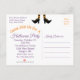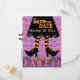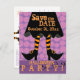 Inbjudan dina gäster till nästa Halloween fest med det här vykortet för roligt som innehåller en häxas svarta klänning med klad i orange och svarta strimlade strumpor och hennes tjusiga svarta skor med orange låsbeslag mot lilans bakgrund. Anpassa detaljerna i party på framsidan och baksidan med ditt eget.