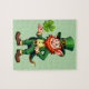 malicieux, vêtu d'un vêtement vert vif. Le lutin porte un grand chapeau haut de forme orné d'une petite boucle dorée. Dans sa main, il tient un grand trèfle à quatre feuilles, symbole de chance. Le dessin présente des lignes claires et nettes et utilise des couleurs vives et contrastées telles que le vert vif, l'or et des touches de noir pour mettre en valeur les traits et les vêtements du personnage.