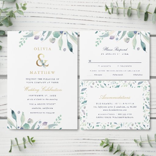 Personlig med prisvärda bröllop förlovningsfest-inbjudningar med information om din händelse. Den här eleganten är utformad med en faux-guld-folie-ampersand med delikat blått och grönt vattenfärgsblad på vit bakgrund. Använda designen verktyg för att anpassa texten, redigera typsnitt och färg eller lägga till egna foton för att skapa en gruppinbjudan för klasser och snyggtar.
