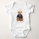 This blue tartan themed Christmas baby one piece has a cute preppy bear holding a pile of gifts. You can personalize with a name.