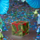 En folie som ser ut i ett djupt rött format utgör bakgrunden till ett vattentätt arrangemang av vattenfärgade löv och bär av grönt, som sprids slumpmässigt över affären.