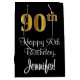 Den här sofistikerade, lyxaktiga och elegantens matade presentsäcksdesign har ett stort ordnummer "90:e" med en imitation/faux-guld-inspirerad övertoning mönster, plus hälsning-födelsedagsmeddelandet "Lycklig 90:e födelsedag" och en personlig mottagare namn i ett skript-stil-teckensnitt. Bakgrunden är svart på färgad. En lyxig presentsäck som denna kan användas när en gåva eller present är ge för att hedra någons nittioårsdag. [~Z0000514]