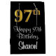Den här eleganten, lyxiga och snyggt-matade presentsäcksdesignen har ett stort ordnummer "97:e" som har ett utseende som liknar faux/imitation guld, utöver hälsning-födelsedagsmeddelandet "Lycklig 97:e födelsedag" och ett namn som tar emot anpassningsbar i ett skript-stil-teckensnitt. Bakgrunden är svart på färgad. En presentväska som denna kan användas när en gåva eller present ge till heder för någons 97-årsdag. [~Z0000514]