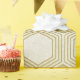 A sophisticated seamless geometric pattern wrapping paper featuring a grid of interlocking hexagons outlined in metallic gold. Each hexagon contains elegant linework and subtle geometric details, set against a softly textured cream and beige marble background. The blend of warm neutrals and gold accents gives this design a modern, refined, and luxurious feel.