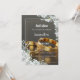An elegant and luxurious wedding invitation featuring golden wedding rings on a sophisticated dark background with white floral accents and a gold border.
