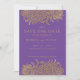 Snygg bröllop spara datum-kort i personlig med lyxfaux snöre i guld på en helt anpassade lila bakgrund.