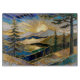 Elevate your kitchen with this luxurious stained glass style mountain sunrise cutting board. Featuring radiant golden light, layered mountain silhouettes, and elegant pine trees, this design creates a refined and peaceful nature-inspired scene.