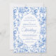 Make a refined first impression with this wedding invitation featuring classic French toile de jouy roses in elegant shades of navy blue, royal blue, dusty blue, and deep blue. Inspired by timeless European floral design, this invitation blends traditional sophistication with modern elegance, perfect for a classic, romantic, or formal wedding celebration.