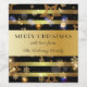 Festive personlig vin-etikett med glansigt glödande snöflingor och stjärnor på guld och svart strimlad bakgrund med ett textområde.