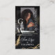 Showcase your professional wig brand or wig studio with the Luxury Wig Artist Black Gold Agate Business Card, designed for a sleek, modern, and high-end aesthetic. The front features a striking black-and-gold agate-inspired backdrop with subtle overlays, complemented by a photo space to display your portrait or signature wig styling work. Personalize with your name and elegant title, creating a refined and professional presentation.