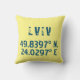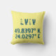 Modernt kuddpölsterdesign med latitud- och longitudkoordinater för Lviv, Ukraina i distressad mörkblå font på gul bakgrund